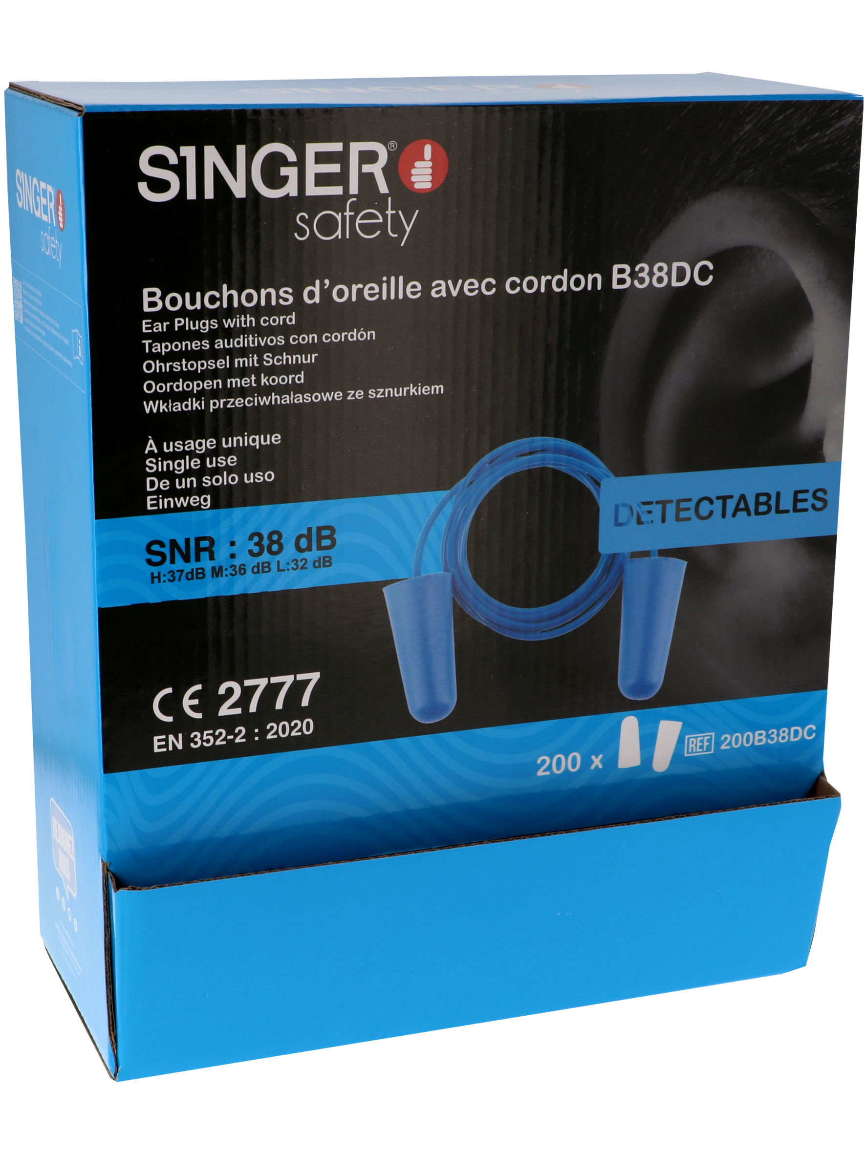 Corded PU detectable blue earplugs. SNR:38dB. Dispenser box of 200 pairs