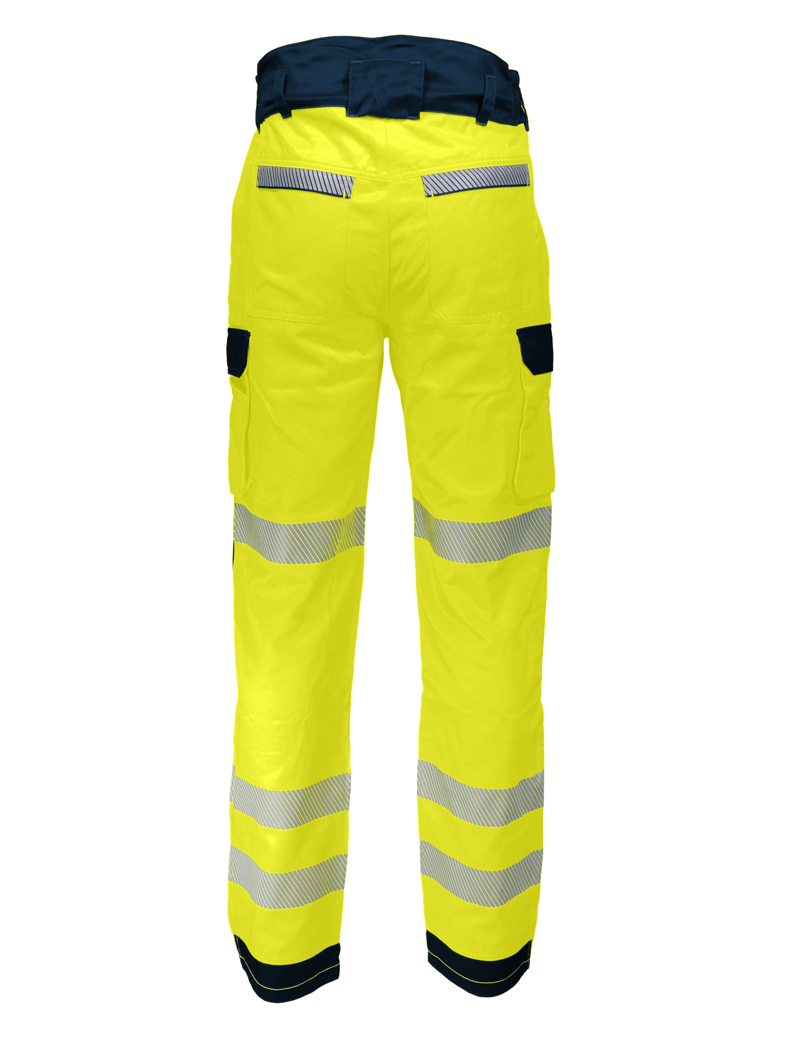 High visibility work trousers. 54% cotton and 46% polyester, 270 gsm.