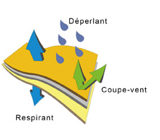 - une couche extérieure sur laquelle est appliquée un traitement hydrophe qui apporte au vêtement des qualités déperlantes. Ce traitement permet à l'eau de glisser sur la surface du tissu et de réduire sa faculté à le pénétrer et donc également à l'alourdir. De plus le vêtement ne garde pas l'humidité et sèche rapidement. Pour autant un vêtement déperlant n'est pas complètement étanche. - une couche intérieure en polaire apportant le confort et l'isolation contre le froid - et une fine membrane intermédiaire prise en sandwich en TPU imperméable et respirante (des pores microscopiques permettent à la vapeur de passer mais pas l'eau de pénétrer). |