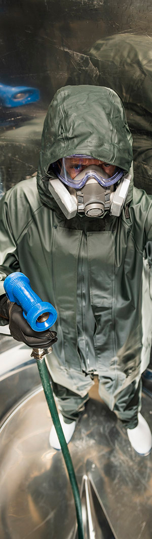 Ik gebruik een ademhalingsmasker (bij voorkeur isolerend), beschermende handschoenen,
